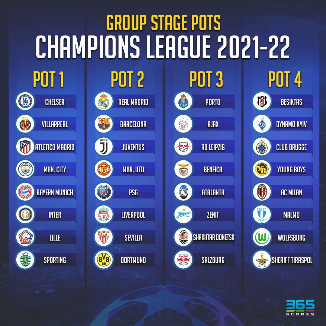 Champions League pots one two have been confirmed for the 202122 edition of the European competition with Chelsea and Manchester City being cast in the top tier. The draw for the group stage was held in Monaco on 29 August 2014. Click to see our best Video content.